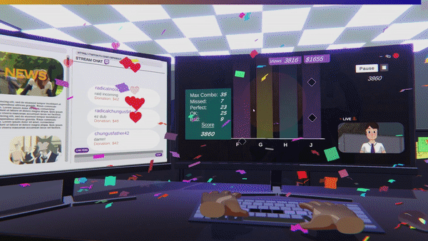 It act's as a traditional rhythm game with a combo, score etc. However, because you’re simultaneously streaming the game for your fans the better you score, or higher the combo is the more views you will attract. Similarly if you spend too much time working, your viewership will decrease. The higher your viewership, the more chat donations you will receive. You can use the money to spend at the store to buy power ups or decorations to modify your office space or surroundings, that may or may not keep the boss away.